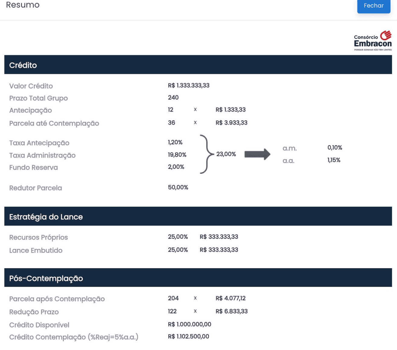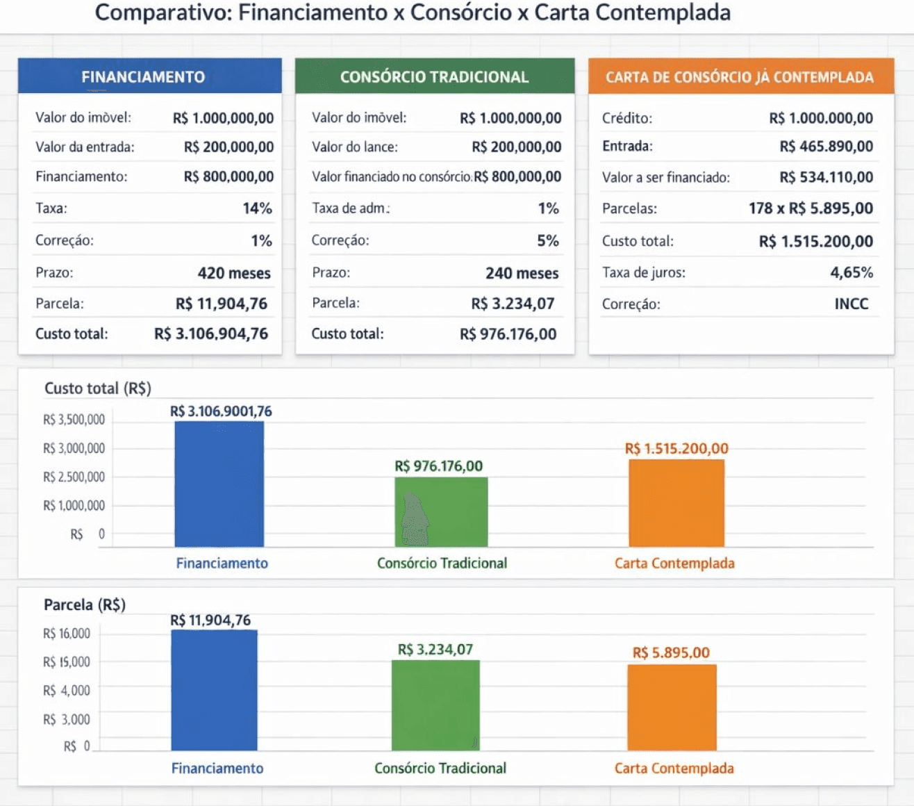 Duas propostas podem ter a mesma parcela, mas custos totais completamente diferentes.